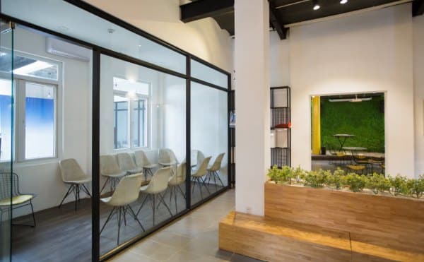Un coworking puede integrar vegetación, paneles de madera natural y mamparas móviles que adaptan el espacio según el flujo del día.