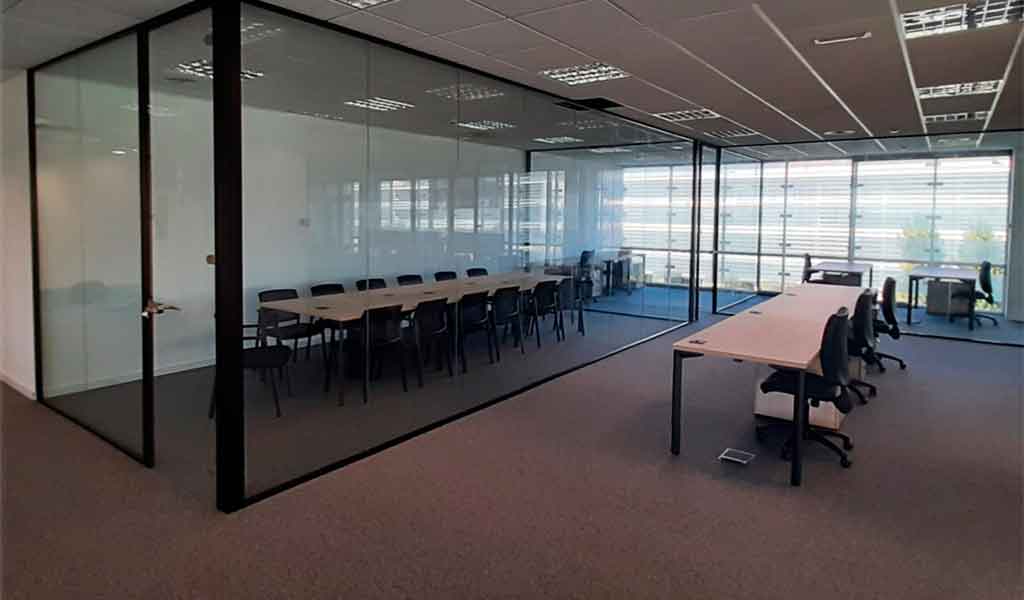 - Estética moderna y luminosa: El diseño abierto, combinado con mamparas de cristal, permite que la luz natural se distribuya mejor, lo que mejora el ambiente de trabajo y reduce el consumo energético.